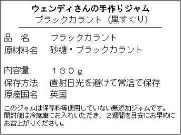 生産終了により取り扱い終了いたしました。 【ウェンディさんの手作りジャム ブラックカラントジャム130g】 和名:黒房すぐり。黒く甘い実をつける植物です。ウェンディさんの手作りジャムの中でも、じわりじわりと人気の出てきたジャムです。プリザーブスタイルなので、実がぎっしりと詰まっています。ヨーグルトによく合います。