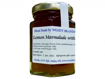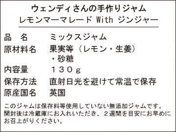 生産終了により取り扱い終了いたしました。 【ウェンディさんの手作りジャム レモンマーマレードwithジンジャー130g】 レモンの酸味とジンジャーの辛みが、いっそう締まってさわやかな風味となって口の中に広がります。甘さ控えめなので、さっぱりとした味が特徴です。お湯を加えてレモネードにしてもお勧めです。 ※商品名:レモンMはレモンマーマレードの略です。