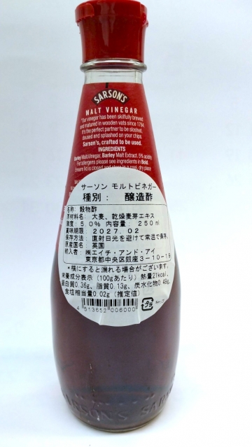 【サーソンモルトビネガー250ml】 麦芽から作ったビネガーの甘く爽やかでフルーティーな香りとまろやかな酸味が特長です。 英国の伝統的な料理である“フィッシュ&チップス”にひたひたに振りかけて食べるのが英国スタイルです。